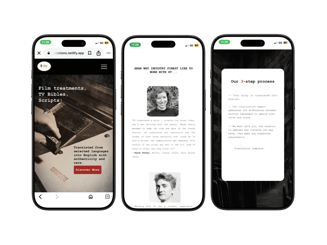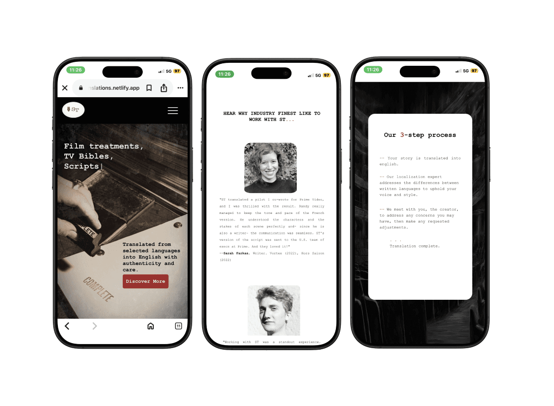 A one-page website created for a client specializing in film translation. The goal was a minimalist, cinematic design that communicated precision, storytelling, and sophistication.